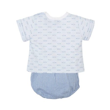 Conjunto color marino con estampado pececitos, ranita en vichy. Composición: 100% Algodón de Alta Calidad.